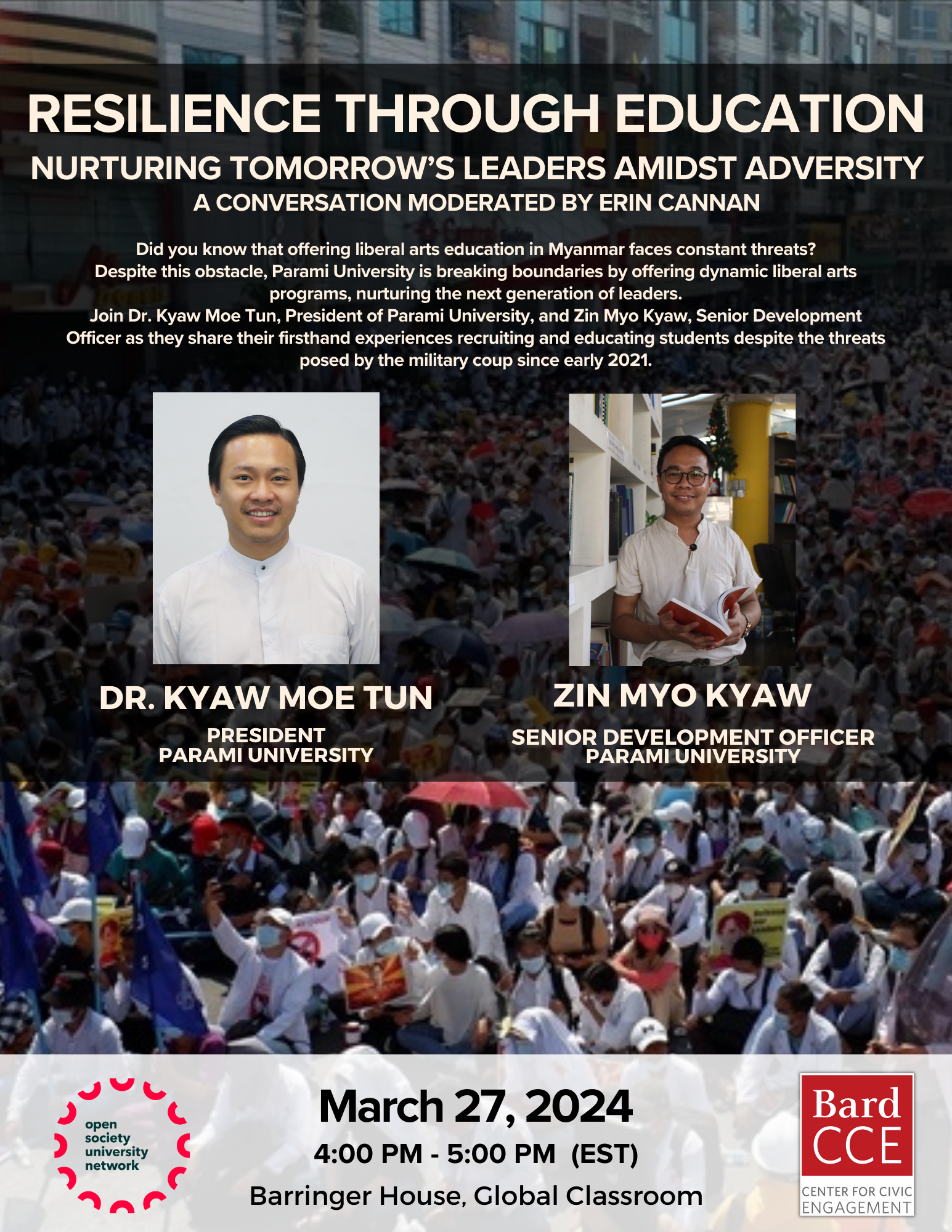 Nurturing Tomorrow's Leaders Amidst AdversityA Conversation with Dr. Kyaw Moe Tun, President of Parami University and Zin Myo Kyaw, Senior Development Officer, moderated by Erin Cannan Barringer House 4:00 pm – 5:00 pm EDT/GMT-4 Did you know that offering liberal arts education in Myanmar faces constant threats? Despite this obstacle, Parami University is breaking boundaries by offering dynamic liberal arts programs, nurturing the next generation of leaders. Join Dr. Kyaw Moe Tun, president of Parami University, and Zin Myo Kyaw, senior development officer, as they share their firsthand experiences recruiting and educating students despite the threats posed by the military coup since early 2021. Download: BARD CCE EVENT.pdf |