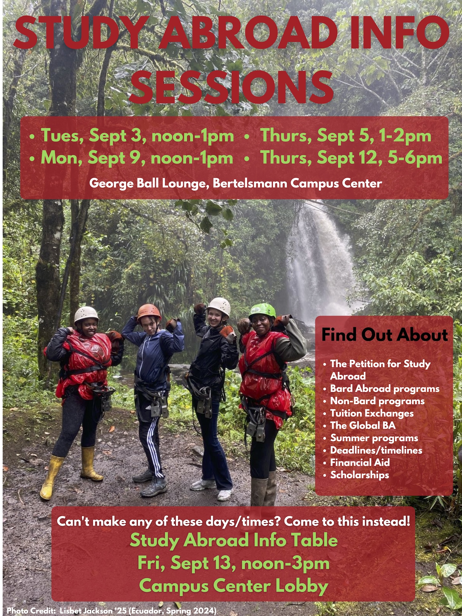 Bertelsmann Campus Center, George Ball Lounge 12:00 pm – 1:00 pm EDT/GMT-4WONDERING HOW STUDY ABROAD WORKS AT BARD? Come to this session and all will be revealed! WILL DISCUSS: Attention Juniors! The Petition for Study Abroad process Bard Abroad programs Exchange programs Language Intensive programs The Bard International BA Financial Aid/Scholarships Deadlines/Timelines (Deadlines come EARLY in the fall term!)COME SEE WHAT’S POSSIBLE! Want to study abroad for Spring 2025? You must attend an Info Session or the Drop-In Table on Friday September 13, then schedule a one-on-one meeting with Director for Study Abroad Trish Fleming (the earlier the better), email: [email protected] |