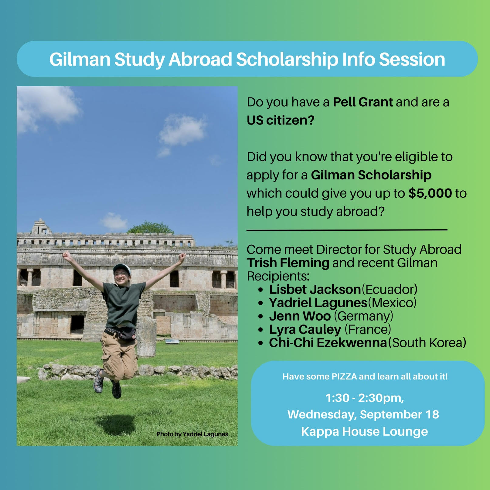 Kappa House Lounge 1:30 pm – 2:30 pm EDT/GMT-4Are you a Pell recipient? Are you a US Citizen? Do you want to study abroad? If you answered "Yes!" to all of these, come and learn how you could receive up to $5000 towards your travels! Come to Kappa House Lounge on 9/19 (1:30–2:30 pm) to learn more and meet former Gilman recipients. The next Gilman Scholarship deadline is on Thursday, October 10! There will be PIZZA! |