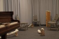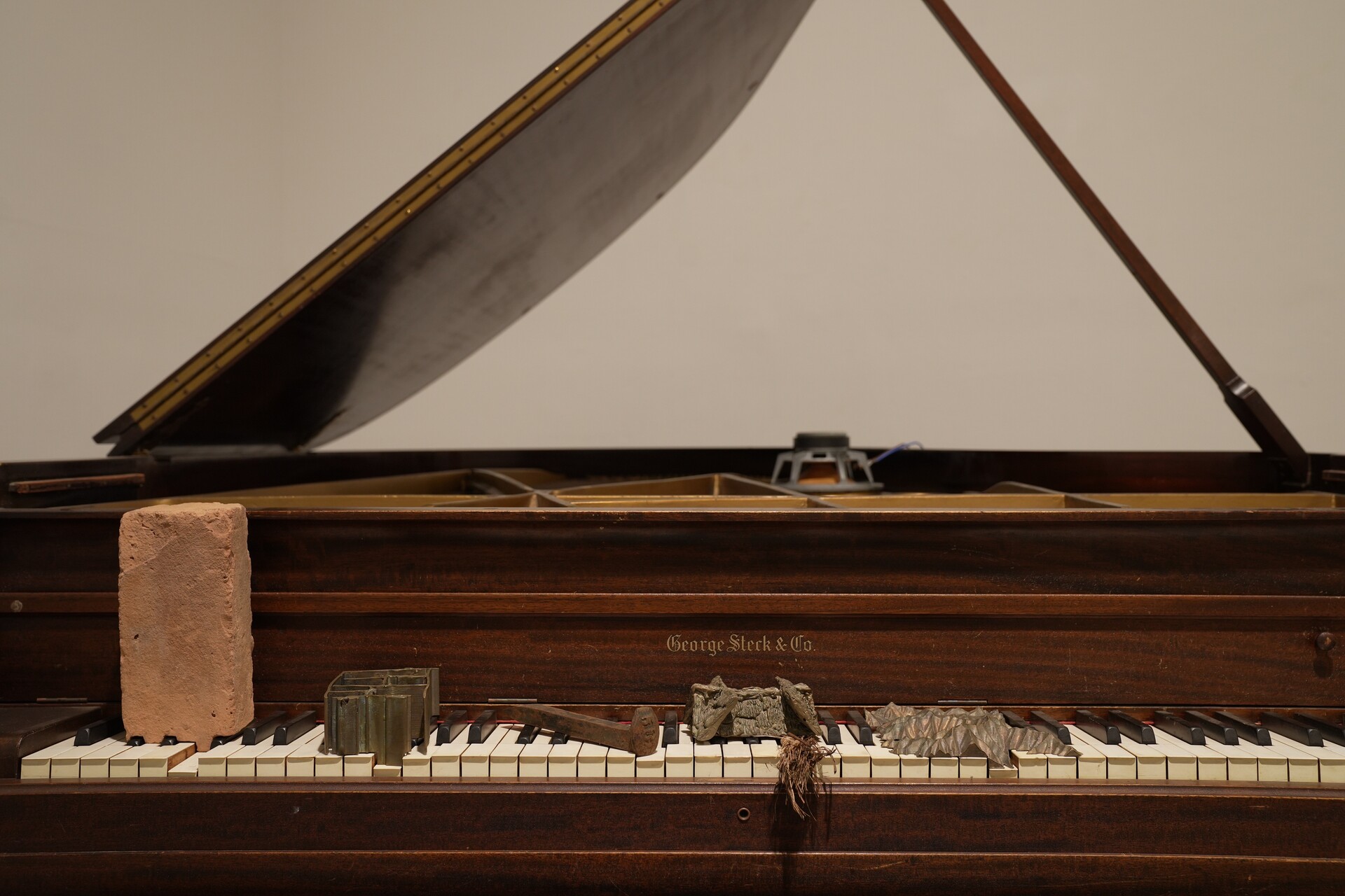 Eli Benjamin Neuman-Hammond, I recognize the mountains, 2023. Cast bronze, brick, railroad tie, straw, audio recordings of conversations between the artist and his grandfather (55"), grand piano, speaker driver, amplifier, dimensions variable, duration: 55 minutes. Photo: Eli Benjamin Neuman-Hammond.