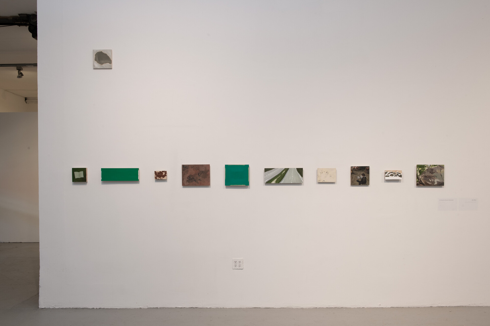 Eli Benjamin Neuman-Hammond, The weight of stones, the way in which winter pushes up, these stones from the earth, in fields perpetually cleared, 2023. Oil paint, wood, each painting: 3 to 10" x 4 to 18". Photo: Estefanía Landesmann.