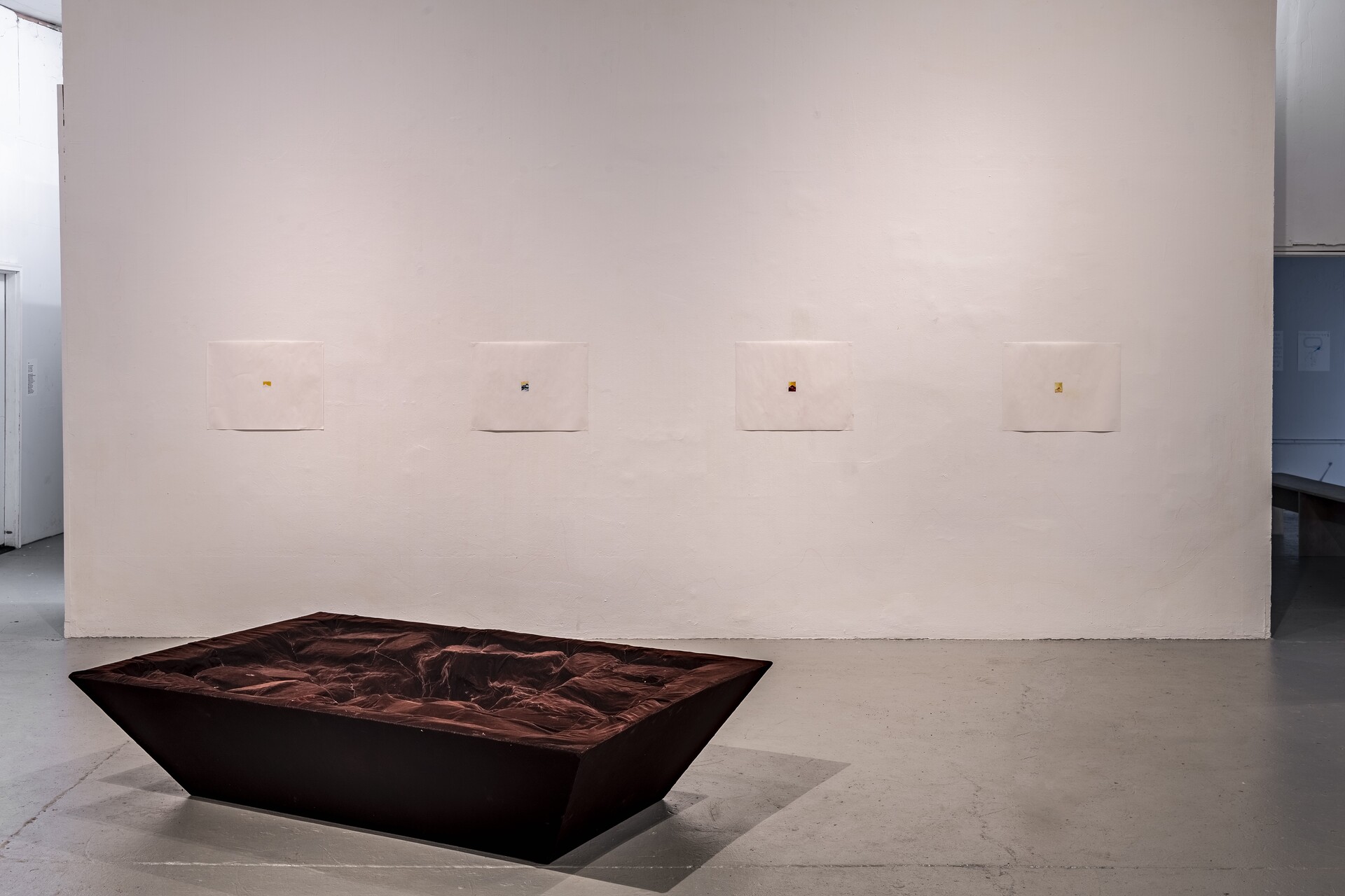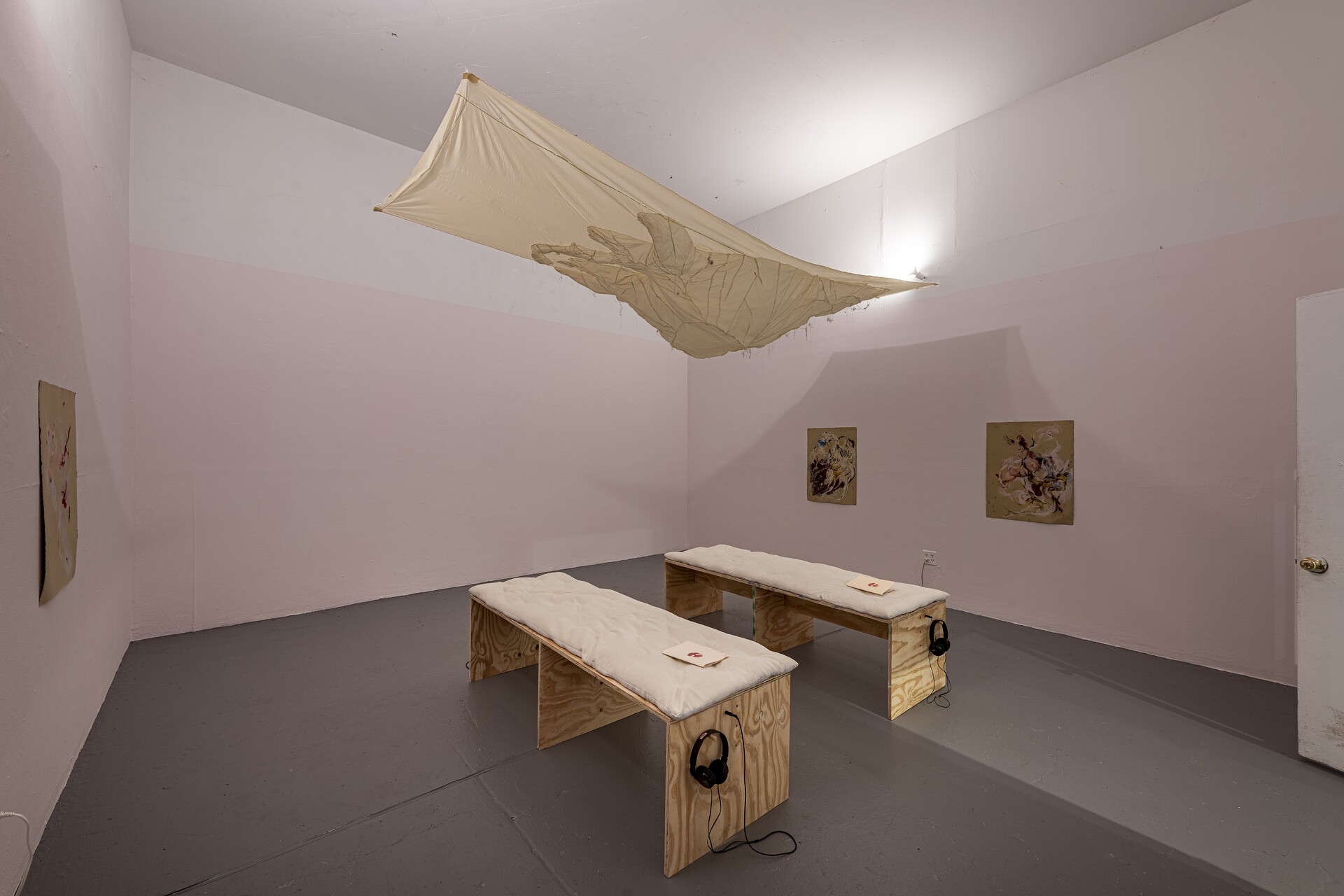 Anna Roberts-Gevalt, "Sick Center", 2023. Sophora tea-dyed cotton, velvet, spray foam, pine boards, aqua resin, cotton, thread, sophora tree bud tea, quercetin, visual descriptions, fishing line, buckwheat husks, paper, cork board, push pins, masks, oil pastels, bell, book, audio play. Photo: Chris Kendall.