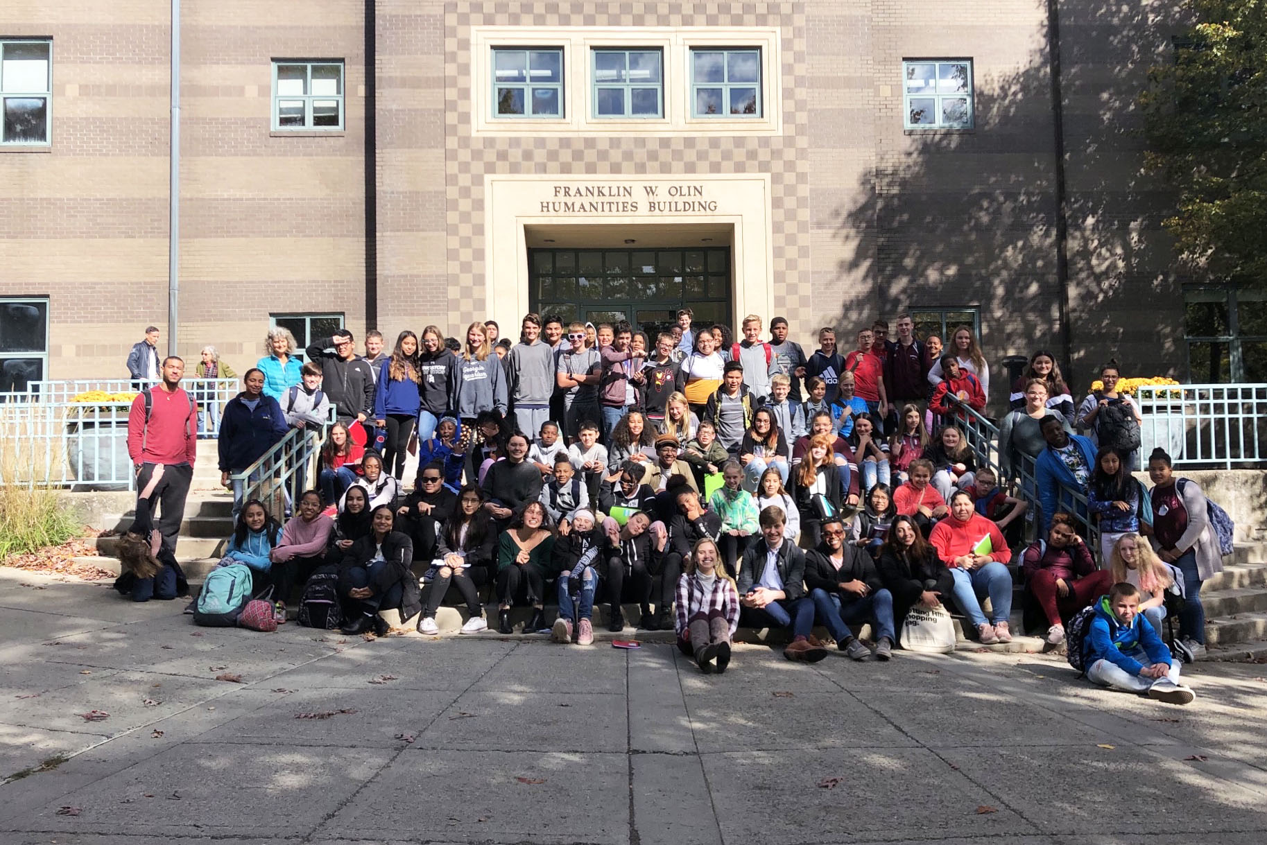 On Friday, October 18, nearly 100 middle school students from Miller Middle School in Kingston, New York, spent the day at Bard College working with undergraduates from the course Pedagogy and Practice in Civic Engagement, an Engaged Liberal Arts and Sciences offering that is crosslisted between Bard’s undergraduate and master of arts in teaching programs. This course is cotaught each year by Bard MAT visiting faculty member Mary Leonard and BHSEC Newark faculty member Michael Murray. The course is designed for Bard undergraduates who are working in one of the College’s many educational outreach programs and who are committed to the idea of civic engagement. Guided by readings in education, the class considers the interpersonal, cultural, social, and ethical issues that arise in the context of civic engagement in schools.