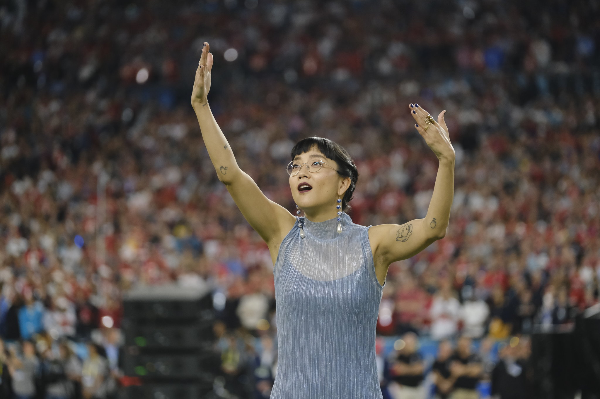Photo: Christine Sun Kim performing the national anthem in American Sign Language at the Super Bowl on Sunday. Photo: A J Mast for the New York Times